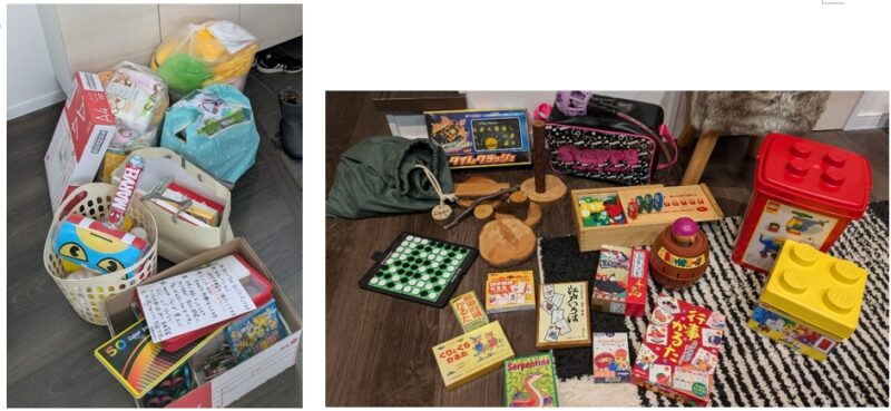 私の家や友人達の家で不要な、絵本、文具、おもちゃ、古タオル、などなどを集め、